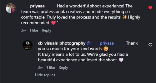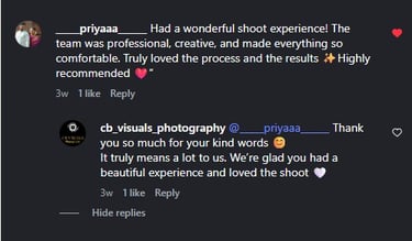 “Had a wonderful shoot experience! The team was professional, creative, and made everything so comfortable. Truly loved the process and the results ✨Highly recommended ❤️”.”